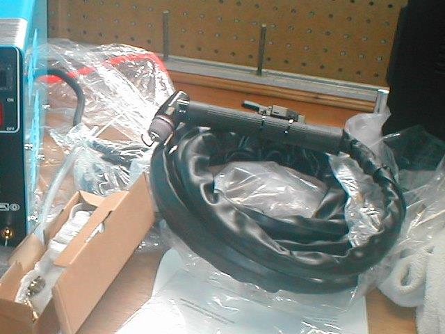Fixed. Cut about 2" off, resolder to 2 pin plug so sheath goes thru restraining clamp. First though used two layers of 3/16" shrink tube then two layers of 1/4" to build up enough for the clamp to function. I also cut off the crimped eyelet on the single pilot arc wire. Slipped over some black heat shrink. Again used self sealing heat shrink eyelet, then shrunk the black on top. Stave off wire flexing/breaking over time at the terminal end. Cut eye so I can remove without completely un threading the red knob. Got tired of chasing knob or the flat washer across the shop.