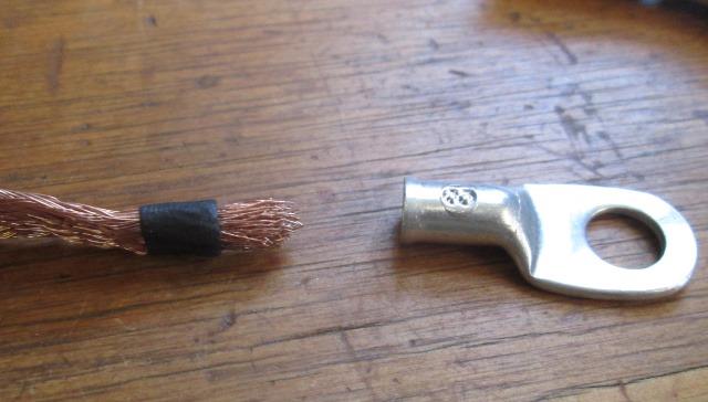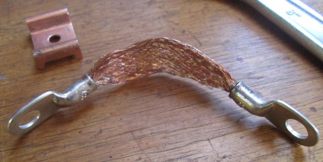 Drill out the riveted side of clamp to remove strap. Lightly formed one end of flat braided wire to insert into lug cup, slip over piece of shrink to hold. Tinned it then used torch to heat lug & partially fill with solder. Still heating insert end of wire. Let set a second. Cut off the shrink tube. Repeat for other end.