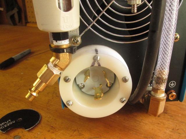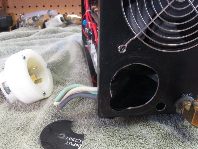 Started. Several things have happened to get to this point. First, as the connections to switch came out pretty sanitary and I don't know if useable on mig welder decided to cut cord about 2" outside of machine, easier than redoing. As it takes almost 2' of wire inside of machine this will give me a true 35' outside. It will decrease length if used on mig to ±16' outside-still, twice and heavier than it has, project for another day. Used bolt cutters and whacked it off. Removed the strain relief and pulled cord inside. What I wasn't sure about- If I had room inside for receptacle-I don't. Cut two donuts out of 1/2" PTF I had (cutting board) to make spacers. After removed most of the plumbing I started out with hole saw. Cutting thru case & existing cord hole was working but I was waiting for it to catch- stopped before disaster happened and used jig saw to finish. Thinking the whole time I have a plasma. With screws loose thru receptacle flange and spacers in place removed one, used small drill bit thru flange & spacers to mark hole. Removed and drill clearance hole thru case. Did for all 3. Then I drilled thru completed assembly on case for 2 more.