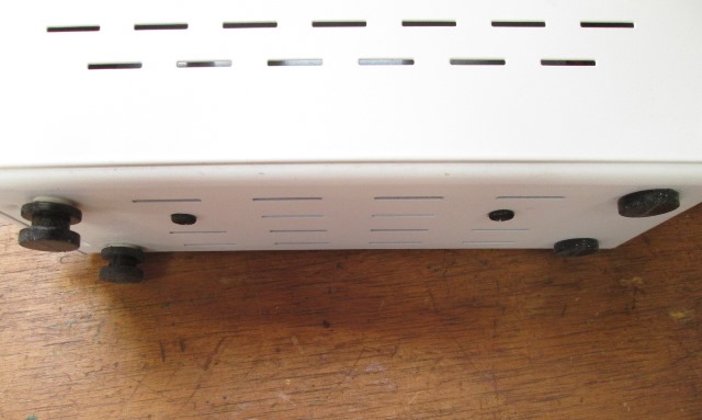 Note; when drilling I started from inside of bottom plate drilling out. The metal is very soft and smushed outward about 1/8" which makes the feet stand further out, good thing on the front so the rear holes I drilled from out side in so feet are against bottom. This raised front of case about 9/16" higher than rear, easier to see face, more clearance using the binding posts. To drill for feet as mentioned I removed power supply internal components to ensure no metal debris. It also would be easier to add the switch in front. Well there isn't room. What I ended up doing was remove the USB power port, more important to me to have easy on/off.