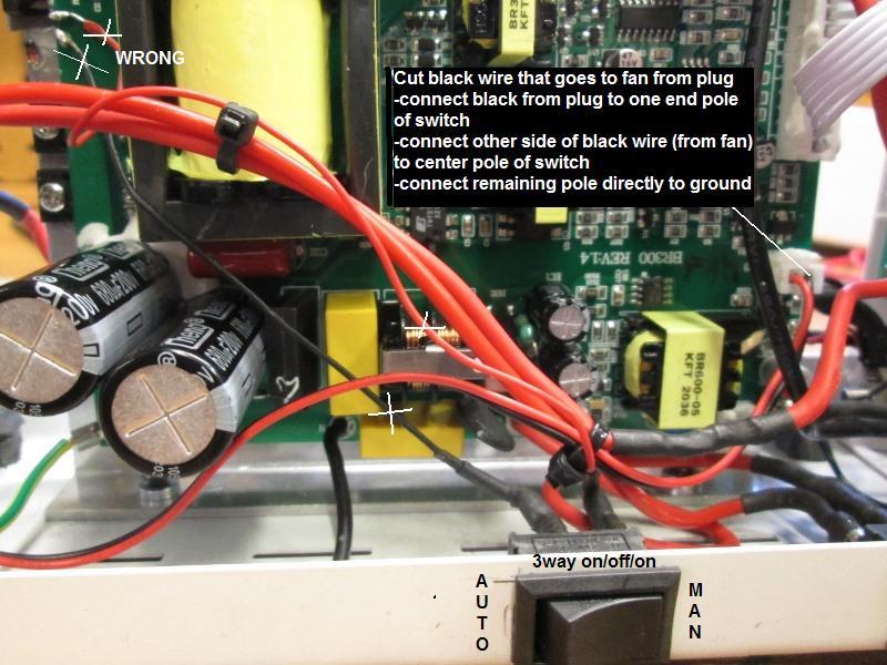 Worked but once wired switch jumps the 2 terminals fan comes on - flick off, fan goes off but comes on when detects set heat temperature. HOWEVER connect a load and turn on fan it disconnects the DC output? FAIL. I hadn't checked meter when testing for this but I dont understand what it does. When high temperature is detected it completes circuit and allows fan to come on, DC output unaffected. Manually jumping the terminals operates the fan but kills DC output. Puzzling. Further probing, found the red pin fan is plugged into is always 12v hot. So the temperature probe connects the ground pin of fan plug to ground but not directly. Grounding the ground pin at fan receptacle manually turns on fan without affecting DC output. So the little temperature link triggers something to ground the fan plug. No picture so doctored fail, removed added wires from switch to board. Cut ground wire from fan, connect to center pole of switch. Connect black wire from board plug to one terminal of switch. The other end terminal of switch directly to a ground. Now it works. Ground from board plug- thru switch to fan for auto as designed, or fan ground thru switch for manual on. Had I known the fan positive lead is always 12v hot, could have used that to add smaller fan- oh well this works-Im done.