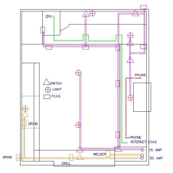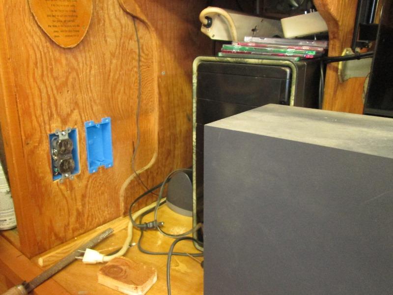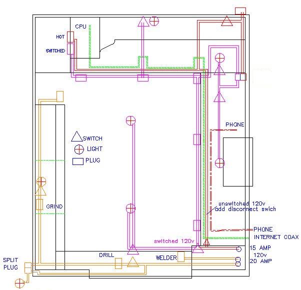 So starting at the beginning of this convoluted procession: ![]() Basically where I started. THe plug at upper left for computer is where new radio and power supply set. Plug in transformer wire were run to hot plug at lower right. Started out simply running a pair of 18ga wires all the way to front of shop for the transformer to plug in that wasn't turned off at night for radios memory. Which worked keeping memory alive when ATX and rest of shop shut off. Discovered though this ATX power supply needs to be plugged in a while(standby) before radio is turned on. Turning on power to ATX, turning it and radio on (disconnecting wall wart) before it 'charges' it would shut off, dumping memory as wall wart no longer connected. So power supply really needs to be in standby, So I'll run a new always hot line & plug to keep power supply in standby, then realized be nice to have computer on switched line. Also there's an outside plug, top right, that's used for trucks trickle charger-when used I have to leave entire shop energized so be nice if it were on that separate feed.