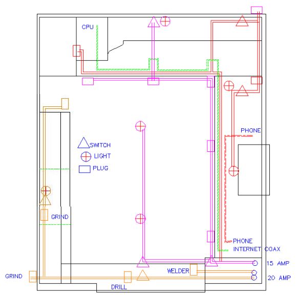 So just disconnect above plug from switched line and connect to the new always hot line. Ran new wire from before main switch, shown red, converting existing CPU plug to always hot.. Also disconnect branch line that fed outside plug from switched line and an tied to new hot line. Few gotchas, the newly converted plug that power supply & computer are plugged into there is several other things plugged in that don't need to be or want hot. Second the branch that feeds truck charger plug also feed couple of lights (though I didn't realize until later). So now we have a whole bunch of stuff on the unswitched line. Just more stuff to check and turn off-maybe its ok. First night Margaret went to shut down shop and the over head light stayed on. She comes in ? one of the shop lights wont turn off? Oh-I simply hadn't checked, they are downstream from the moved outside plug. I had remembered the overhead lights branching off before the outside plug. doh And then the electric heater on the 20 amp circuit. Decided it would be better to move electric heater to off the 15 amp line. So added receptacle for it. Next morning coming out to shop noted the heaters indicator light is on...hmmm. If the heaters switch were left on means it could have run all night- Not shown but outside motion light is tied into outside grinder plug so I can no longer turn that circuit off either. The 20 amp circuit been want to change since I had added outside light, now even more motivation. The interior lights on top of unneeded stuff on hot line make redoing worth while. First the 15 amp circuit.