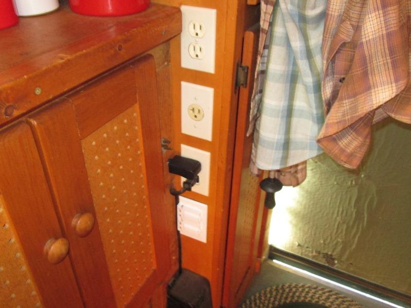 The exterior truck plug and over head lights an issue. Simply can no longer easily get between the 2. I can disconnect but cant retrieve or replace the branch wire that goes up to plug from current route. Well not without some deconstruction-cutting in a new box-not worthwhile. The wires run thru outside receptacle but also thru separate surface mount switch. The feed is to a overhead receptacle, the overhead lights plug in. I can run new wire up to it from the front side down, but the existing feed? I could put another box and abandon & terminate the current feed in it, wouldn't disturb exiting plug and switch. Hmm Then I realized I could split the existing receptacle, one half of receptacle feed from hot line. Leave everything as is, simply run new wire up to feed the other half of receptacle with switched feed to plug in lights! Cool and simple. Well easy solve, running new wire in wall took a bit, tapped switched line. Half of overhead receptacle feeding lights that are on main kill switch. The other half always hot, mostly a safe termination for end of hot line without redoing stuff. Good place for phone charger.