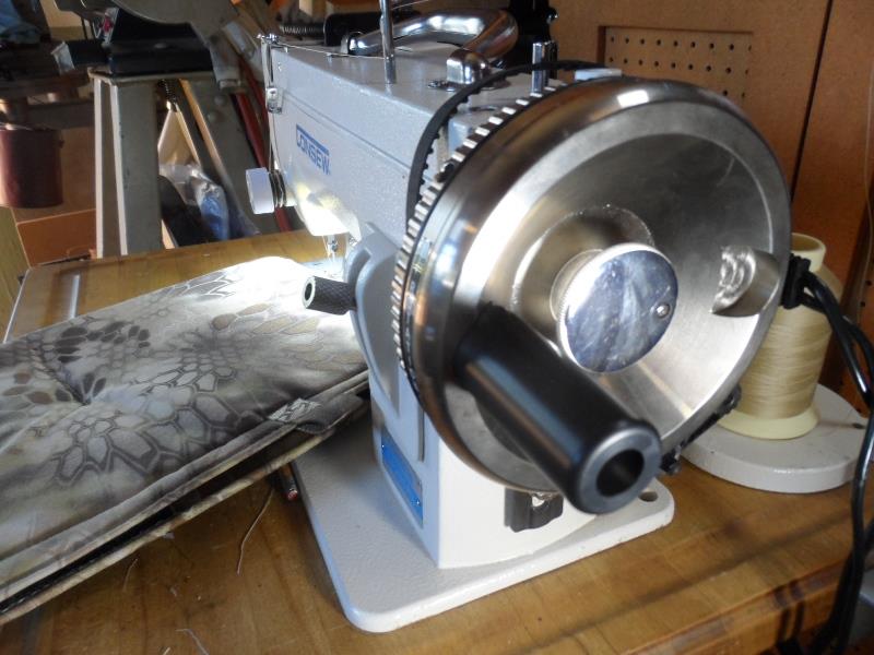 Consew CP206RL sewing machine is allowing me to sew thick heavy materials without breaking machine. Liking it a lot. Pricey (and this is an inexpensive machine) however its WAY too fast for me. Trying to control with foot pedal slow enough for me bogs down motor. Plan from the get go was to replace the balance wheel with Monster wheel from Sailrite. They are quite a bit larger than factory wheel and considerably heavier. Basically weighted gear reduction. In and of themselves can slow down machine a lot and also increase power or torque at slow speeds. Handle (and its weight) allows use by hand, whether no electricity or for me starting stitch. To truly get machine to run as slow as I want I'm also adding a Sailrite WorkerB Power Pack Motor System. Stronger motor with speed controller. Almost price of this machine but in conjunction with the Monster wheel I will have a machine I can fully control down to stitch byyyy stitch. I looked at under machine speed reduction but this new kit from sailrite will be perfect. But another project.