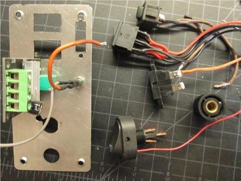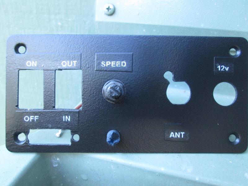 Didn't take long to see moving existing ATX (power supply) toggle switch and radio antenna rocker power switch to panel with new switches would be a bit cleaner. So a little rework needed. Adding an on/off power switch before controller and a fuse on the output. The reversing switch of controller is remote, has an off position but its the output and don't want electronics powered, though slight, when not in use. Adding small pilot on power input just incase, so with 7 units laid it out to see what/how to fit on small aluminum lid I had.