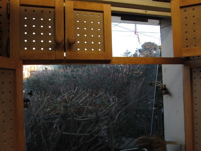 With window frame fixed, now to the glass inside. I decided to replace with a single full piece of plexi. Hinged at the top so I can have open when raining. (You can see original slider track on sill)