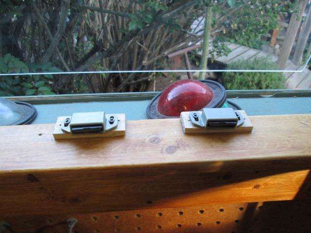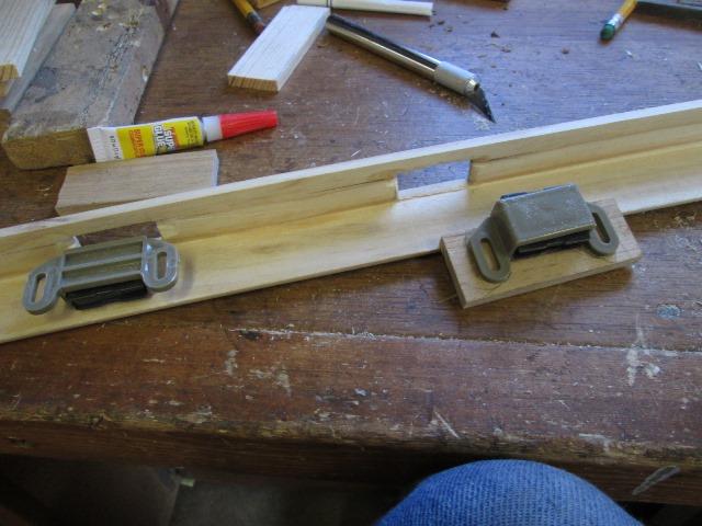 Simple corner moulding cover (right latch upside down). Once I had holes cut realized no way to place catches on sill and expect to line up with holes in trim. Remembered folks using crazy glue on wood so used to place. Insert catch thru cover, glue on block pushing both inside face of moulding to locate catches on blocks. Then put glue on the blocks and used trim set on sill to place.