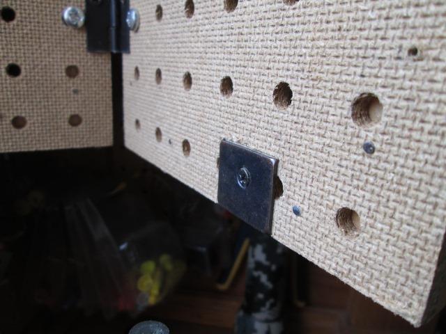 Latches are about middle of panel to keep pulled tight. Otherwise, being bi-folds, slightest pressure against them (stiff breeze) if placed at either side of panel will leverage open. Any way worked slick. I'd never seen these before. Would have been a lot easier on the lower doors than what I had done. The included sticky tape worked well for placing but I wouldn't expect it to hold pulling open. Advertised as mounting with screws or the tape? Fairly strong little magnets. Now were done (again). Back to top of page Back to shop additions modification section Back to Our shops home page