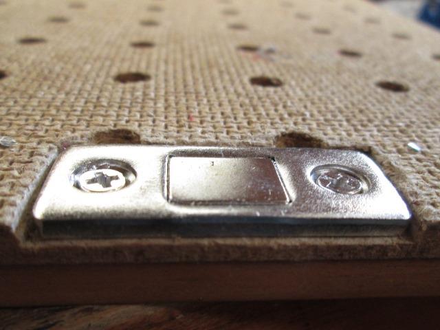 I recessed the magnetic 1/8" thick side into pegboard so shutter will set almost flush. Then placed the latch plate with a stiff piece of paper between to the magnet latch. Using the included double sided tape stuck it to back side of latch plate. Closed door and firmly pressed. Open the door, left the latch plate stuck to window trim. Drilled pilot holes then removed the plate to remove the double sided sticky tape- figured just that much less protrusion. Then remounted the plate.
