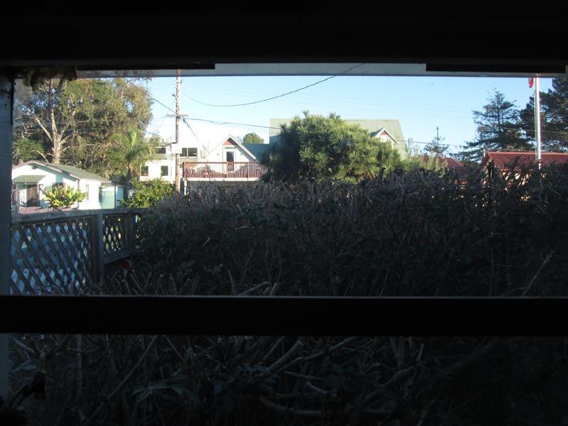 The one behind this one even taller. These are 40+ years old. Working in the yard I recently cut both of em to a manageable level and gain some view/light from window. Walked in side to see what view I gained out window-hmmm. Having never been able to see past bushes amazing and weird. Added light in shop nice. However my neighbors porch looks right into shop. At night I often am standing at this window with lights a blazing. The large bush furthest away I want to cut down even more. But just feel pretty conspicuous at night-even folks walking down the street. Just odd, didn't realize how exposed window would be cutting back bush.