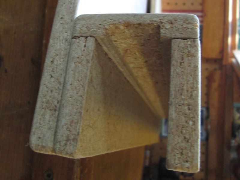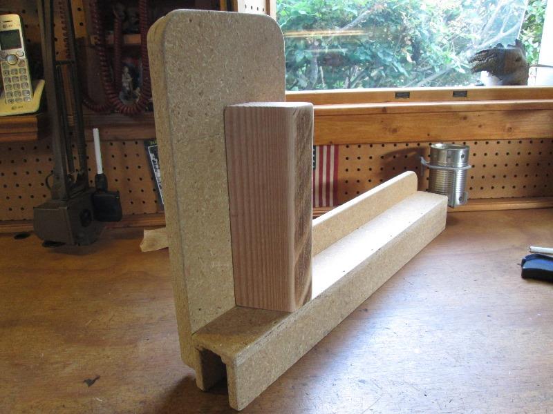 On the back glued and stapled a scrap of 2x4 previously cut at angle. Its purpose is support for the tall particle board section and also act as handle for pushing jig.