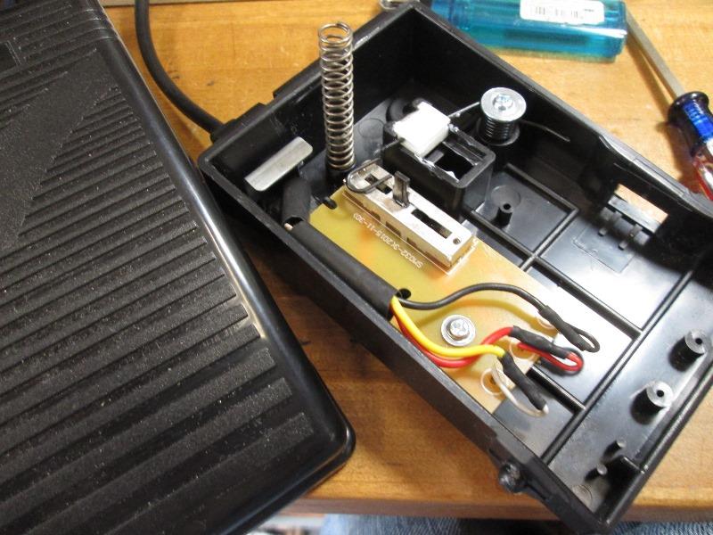 Enough of that Opened up pedal. Cut power leads about 1" from board. Removed the cord. Drilled hole at rear of case and squared up to reuse cord restraint duplicating original. Insert cord thru end of case. Soldered on about 2" to the leads of cord then soldered back to leads on board. Cut a new notch at back of pedal to clear cord when depressed.