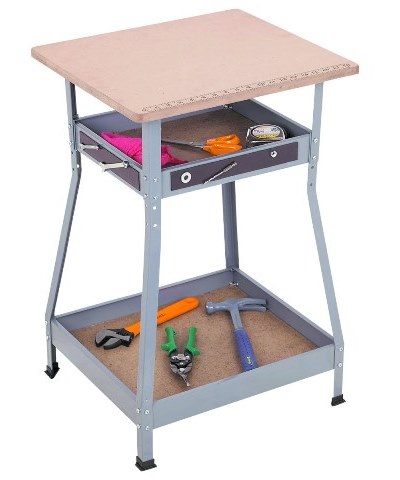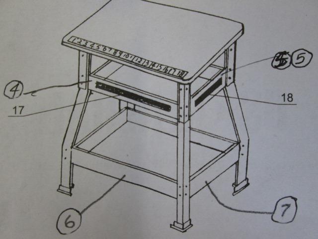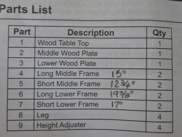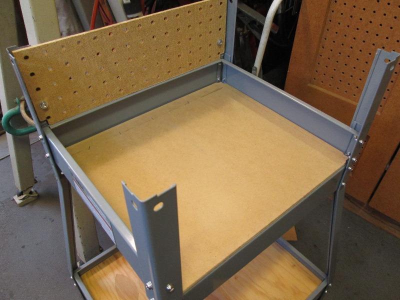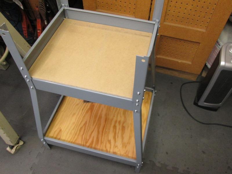Modify Harbor Freight Workstation Table #46725. Update 2022- rework this table to use for walking foot sewing machine See Consew.htm Have want of a small standard table height workstation. Decided to use the H/F unit. Reading reviews looks like some assembly issues but for the price ($24) worth the effort as a start. I'll be adding a power strip, a light and possibly a small pegboard back with shelf. After receiving, noted the 1/8" pressed board on the lower shelf and will be replaced with some plywood. The middle shelf I may laminate after cutting the lower board to top board, however I'm really looking at adding partial drawer. I may add casters but bottom line is I bought the H/F workstation as starting point to make something. The reviews on assembly weren't an exaggeration, I assumed "how bad could it really be"? Most stuff from H/F requires tweaking. Worst I've encountered, I'll note what I found and observations before documenting my workstation mods.