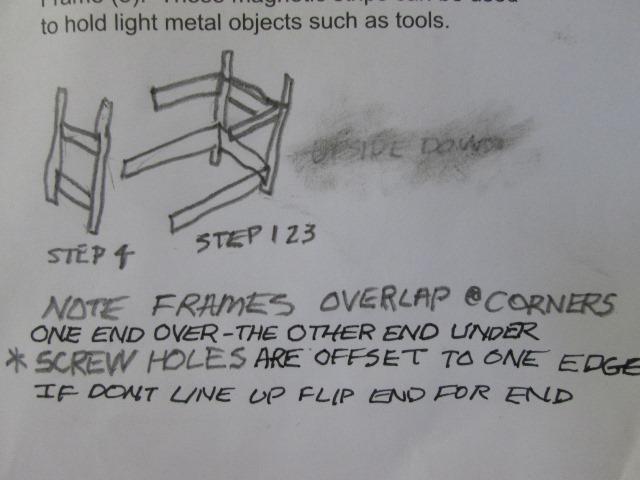 No where is it mentioned in instructions to overlap fames where they meet each other in corner, or the orientation of offset holes in frames/legs. Many assume holes mis-drilled, ends wont butt. But it will bolt together, just not how you think (or likely want) and instructions don't explain. Took me an hour to figure out intent, by that time I also decided I don't want the frames overlapping all catywhompus so modifying so it can be assembled frames flush. Replacing the 1/8" fiberboard shelves, actually they are only 3/32" thick. In the off chance someone assembling one of these ends up here few pictures that might help... STEP 1, ignore the part about tightening the screws; do NOT tighten any screws until done, need to wiggle and flex to align stuff.