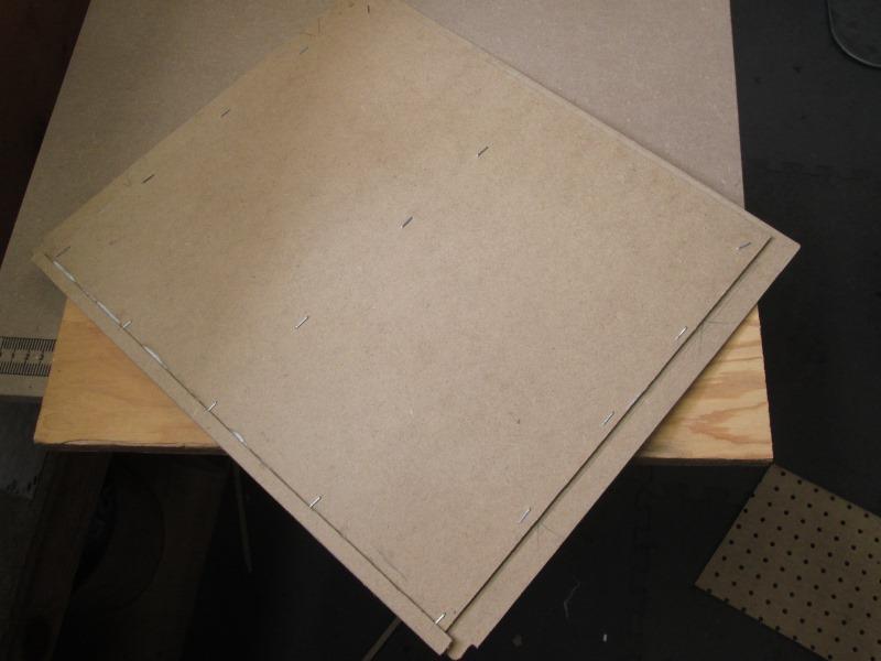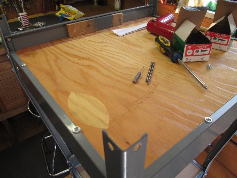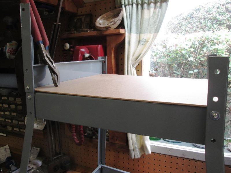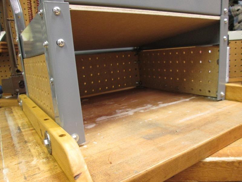 ![]() Decided to box in side and back of top with some scrap pegboard. Drilled thru height adjuster legs and used 8-32 nut and screw. Tops will be held by table top screws