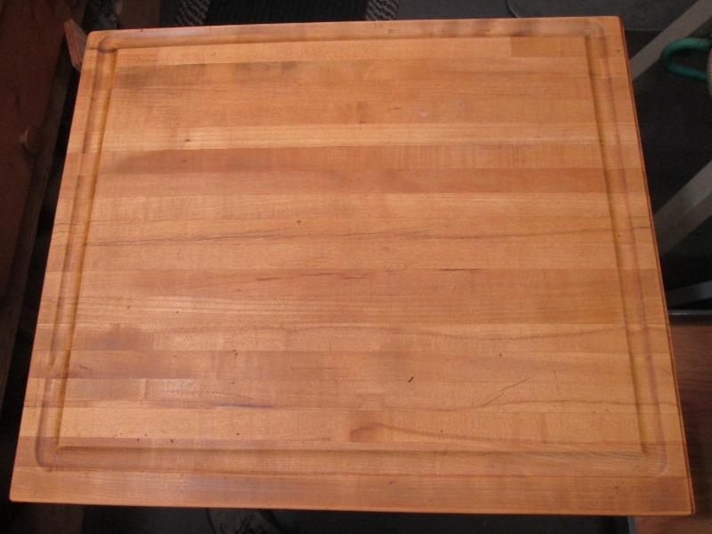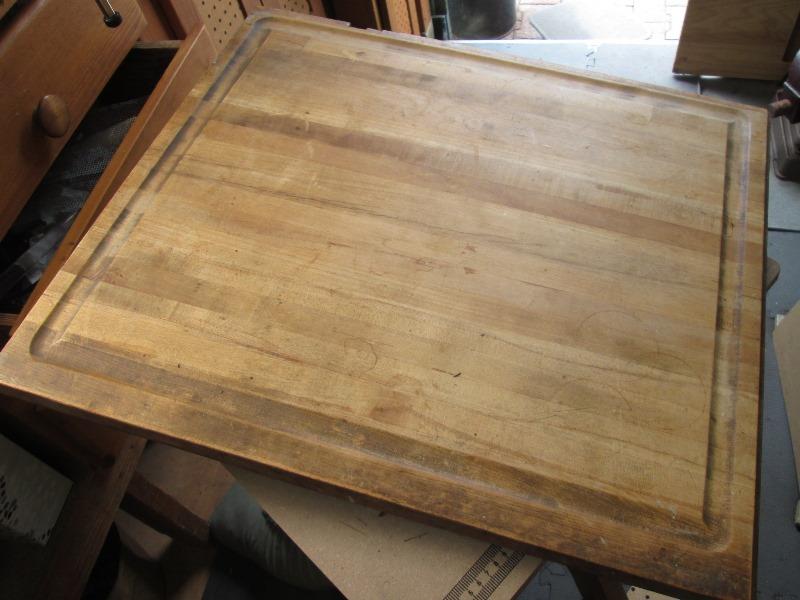 Then I found this...24" x 21" x 1" thick laminated butcher block cutting top. Originally from old portable dish washer, modified over the years for different cabinets, leaning in the scrap pile for at least 10 years.