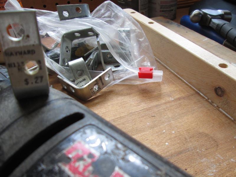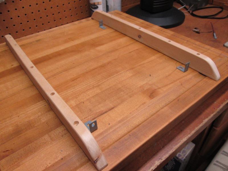 ![]() Have a bag of old 1/8" x 1 1/2"x1 1/2" with 4 holes, from swap meet. Legs will be captured by both sides of the angle. 1 1/4 bolts thru wood rail, 1 screw & nut thru L bracket that will be attached with 2 wood screws. That should hold it.