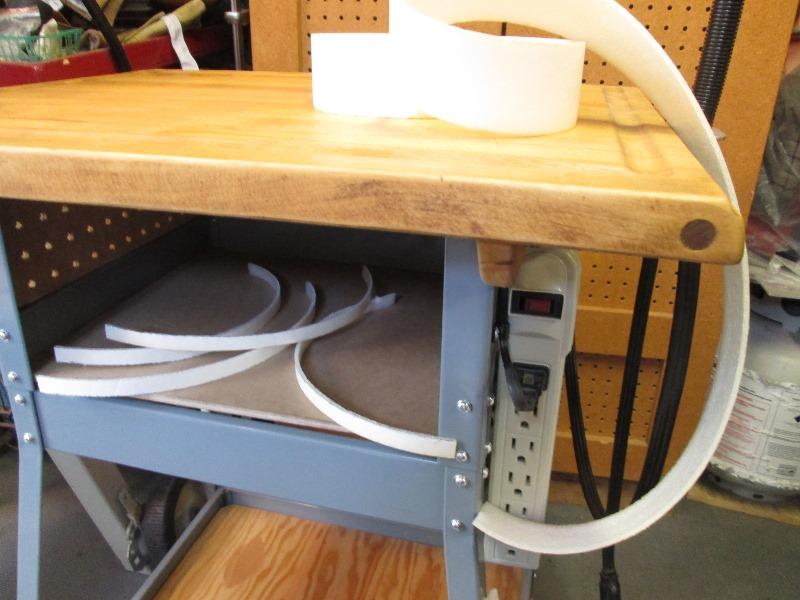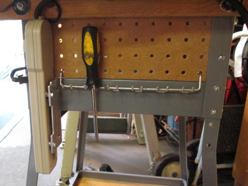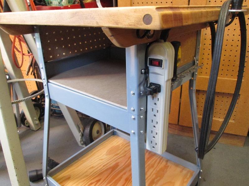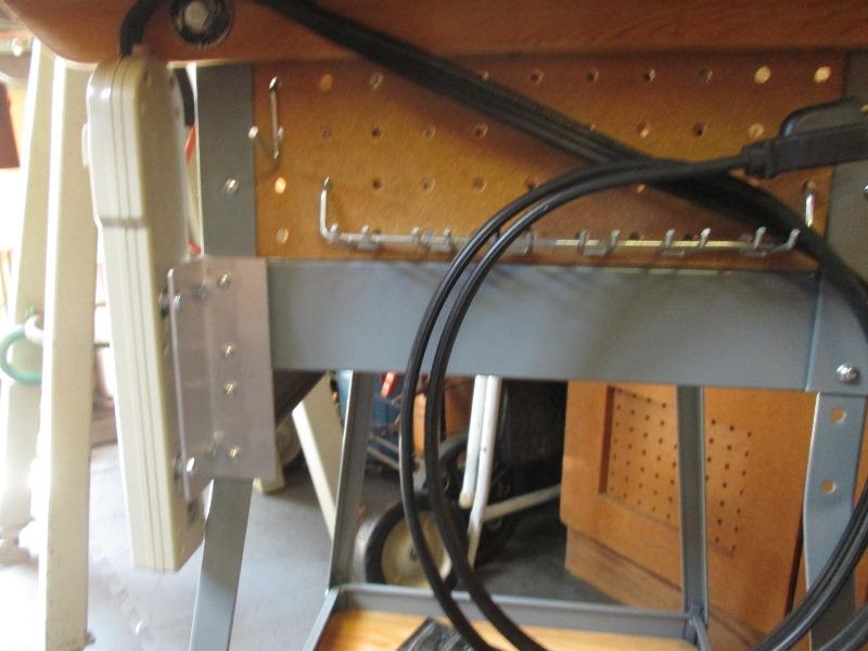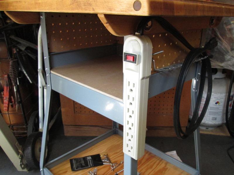 ![]() Sooner than later. Moved the power strip, twice. Keep hitting the cords plugged in. First I remounted so facing at right angle to front of bench but didn't like not seeing to plug in. Reworked the mount to place face forward but about 2 1/2" back. ![]() Drilled and bolted thru the side frame, lead edge slipped (snuggly) in the gap between height adjuster and leg.