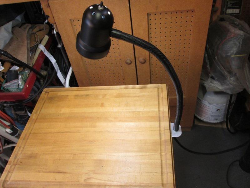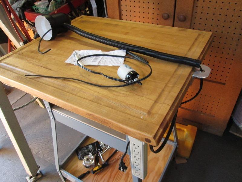 ![]() Adding lamp. 24" flexible goose neck Machine lamp, I had bought few of these awhile back, cheap. Intended to be hardwired they don't have plug so running new cord. Odd running new cord thru brackets nuts etc. Used a scrap of Al angle, notched the top (sides angle)