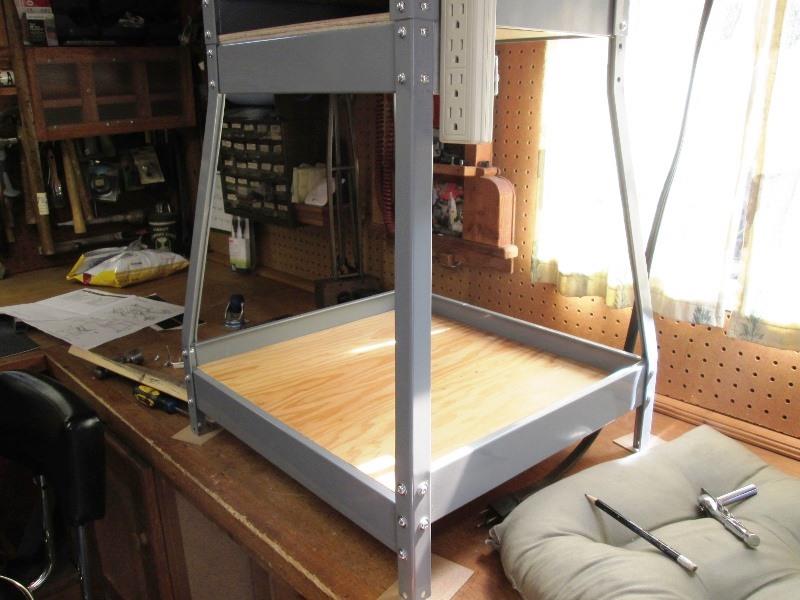 ![]() Started the top but at a quandary...I noticed the adjustment holes would allow mounting the front frame below shelf. Would give more access to whatever is on shelf and room for adding drawers. Still contain at sides and back if used open. It likely subtracts from overall strength, setting at table probably hit with knees- but dang... Looking at pictures realized I'll be adding caster so raise above knee height, placing frame below shelf would give an easy place to mount power strip. Though I think vertically on leg would be more practical. Or on the side frame, cords be out of the way. decisions.. Either way front frame going below shelf. I only need to notch back frame. Use the screws and nuts intended to attach top so same as others. Cut new bottom shelf and start bolting together. Using 1/8" bottom shelf as pattern cut a new one out of scrap 3/4" plywood. Then cut the original bottom to laminate to bottom of top shelf for more thickness. It will fit against back and side rails and set on front frame. Or shorter on sides and back so bottom sheet sets on front frame and top sheet sets in back and side frames. Lip. ![]() Clear as mud...and fail. Front edge still didn't reach the front frame, that actual 3/32" thick verses 1/8" nominal. I ended up gluing on a filler strip across bottom front edge to set on frame. Effectively defeating whole reason cutting as I did. So what I should have done is just cut sheet same size as middle shelf, then add 2 filler strips across front. What I really should have done is just used piece of plywood, routed 5/16" deep x 1/2" wide lip across back and sides. This'll work. Need to coat shelves with something then look at the top. Been trying to ignore but getting close to adding. Uses 4 little L brackets to bolt to legs. Im not sure how many times you could pick up table without pulling top off. Second its a bit small at just shy 18"x20". Could easily go to 18"x24" maybe up to 30" wide and still maintain stability. Does mean replacing top I could have used as bottom shelf. This project turning into 'what I should have done'.